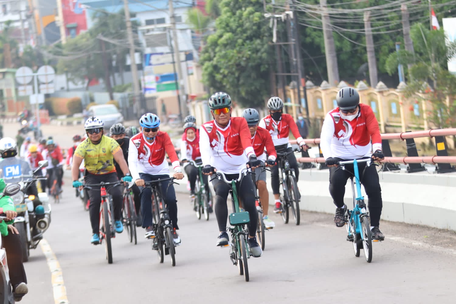 Ketua DPRD Prov. Sumsel, Hj. R.A. Anita Noeringhati, S.H., M.H., melepas keberangkatan para peserta Gowes yang sudah berkumpul sejak pagi tadi pukul. 06.00 WIB, di lapangan Apel Makodam II/Sriwijaya Jalan Jenderal Sudirman KM. 2,5 Palembang.