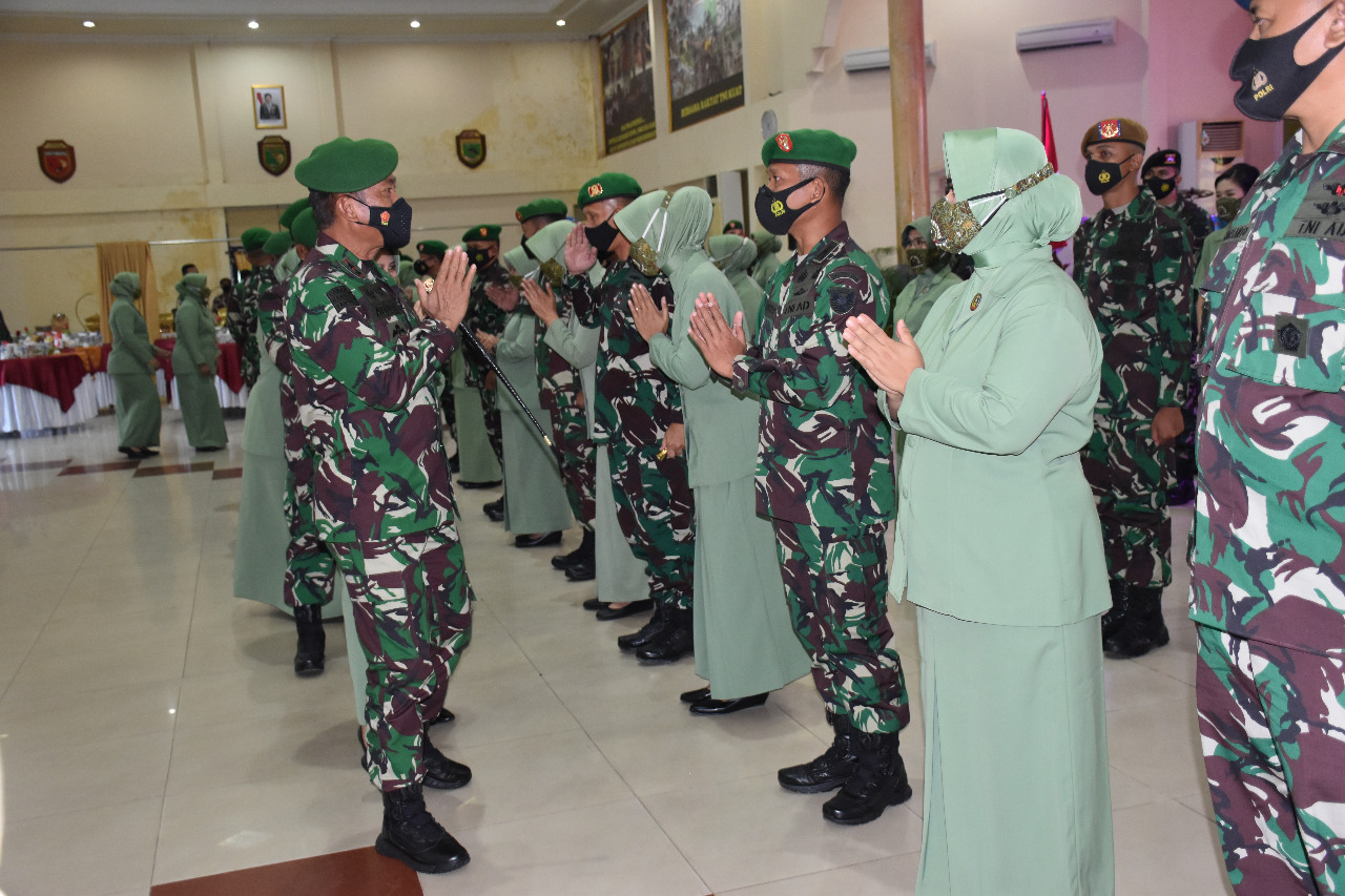 Usai laporan kenaikan pangkat dilanjutkan dengan pemberian ucapan selamat kepada para Perwira yang naik pangkat beserta istri masing-masing, oleh Pangdam II/Swj dan Ketua Persit PD II/Swj, diikuti para pejabat teras Kodam II/Swj bersama istri.