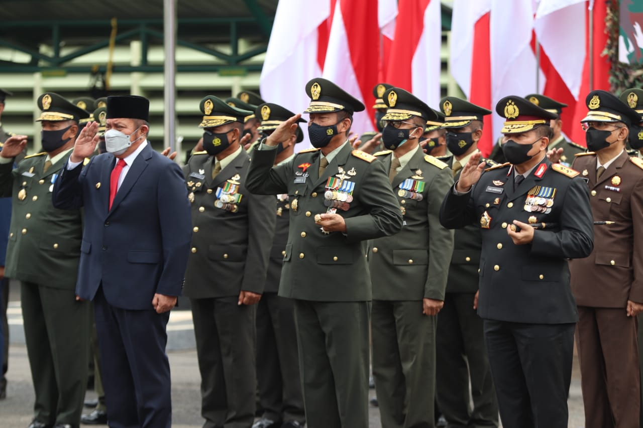Pangdam II/Sriwijaya Mayjen TNI Agus Suhardi bersama Forum Koordinasi Pimpinan Daerah (Forkopimda) Provinsi Sumatera Selatan, mengikuti upacara Hari Ulang Tahun (HUT) Ke-76 Tentara Nasional Indonesia (TNI) Tahun 2021 secara virtual bertempat di Lapangan Upacara Makodam II/Swj Jln. Jenderal Sudirman KM. 2,5 Palembang, Selasa (5/10/2021).