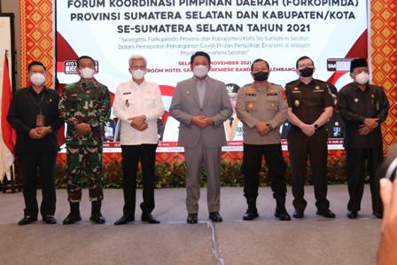 Rakor yang dihadiri kurang lebih 200 peserta ini mengusung tema, "Sinergitas Forkopimda Provinsi dan Kabupaten/Kota Dalam Percepatan Penanganan Covid-19 dan Pemulihan Ekonomi di Wilayah Provinsi Sumsel" . Rakor ini dihadiri juga oleh Gubernur Sumsel H. Herman Deru, Wagub Sumsel H. Mawardi Yahya, Kapolda Sumsel Irjen Pol Drs. Toni Harmanto, M.H., Kajati Sumsel Drs. M. Rum, S.H., M.H., Danrem 044 Gapo Brigjen TNI Mohammad Naudi Nurdika, S.I.P., Danlanud SMH Palembang, Danlanal Palembang, Kaban Kesbangpol, Asisten I Pemprov Sumsel, Deputi Penanganan Darurat BNPB, Kepala Basarnas Sumsel, Para Bupati/Walikota Se-Sumsel, Para Dandim jajaran Korem 044/Gapo, para Kapolres jajaran Polda Sumsel, para Kajari Se-Sumsel dan para Kepala BPBD Kota/Kab Se-Sumsel. Gubernur Sumsel H. Herman Deru dalam sambutannya menyampaikan bahwa, sekarang ini terasa berbeda dan semakin komprehensif dikarenakan seluruh camat dan ikut hadir di hadapan kita meskipun secara virtual mudah-mudahan tidak mengurangi makna juga kita dapat segera meningkatkan kesehatan dan meningkatkan ekonomi. “Saya menginginkan kita semua agar langkah ini ada eksplorasi diantaranya yang saat ini sedang gencar kita lakukan adalah Keroyok Vaksin, bukan hanya sekedar menambah imun juga menambah kepercayaan diri serta dapat beraktifitas seperti sedia kala meskipun tetap harus patuh dengan disiplin kesehatan", kata Gubernur. Dijelaskan Gubernur, diketahui bahwa medan di Sumatera Selatan ini tidaklah sama, ada pegunungan dan ada perairan, yang membuat penyebaran vaksinasi ini sangat ada perbedaan antara satu Kabupaten/Kota dan Kabupaten/Kota lainnya. Awalnya kita selalu merasa terhambat dalam penerimaan vaksin ketika negara juga harus menerima impor dari negara-negara lain dari berbagai jenis vaksin. "Kondisi ekonomi masyarakat kita juga menjadi alasan untuk mereka tidak aktif datang ke Faskes Vaksin, disinilah kita harus menyamakan pikiran agar kita bisa saling membantu Pemerintah Provinsi dan November 50 persen sehingga pada awal 2022 meningkat hingga pada 70 persen yang menjadi target kita", jelasnya. Sementara itu, Pangdam II/Swj Mayjen TNI Agus Suhardi menyampaikan bahwa, kita semua sudah sama-sama mempunyai pengalaman dan masing-masing daerah sudah punya cara sendiri dan ini juga telah disampaikan oleh Kapolda dari segi geografis yang berbeda-beda, karakter penduduknya berbeda-beda dan penanganannya juga kalau dalam memperbandingkan mana cara bertindak yang paling tepat karena kita sudah punya pengalaman, baik itu pada saat awal puncak dari Covid. Pangdam juga mengatakan, ada tiga faktor saja sebenarnya bagaimana kita bisa mempercepat pelaksanaan Vaksinasi yaitu, pertama adalah ketersediaan Vaksinnya, yang kedua yaitu vaksinatornya dan ketiga adalah masyarakatnya. "Ketiga faktor ini kita tingkatkan lagi implementasinya", ujar Pangdam.