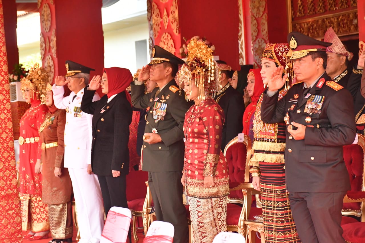 Pangdam II/Sriwijaya Mayjen TNI Agus Suhardi didampingi Ny. Shinta Agus Suhardi Bersama Forkopimda Provinsi Sumsel, Mengikuti Upacara Bendera dalam rangka Memperingati HUT Ke-77 Kemerdekaan Republik Indonesia Tahun 2022, bertempat di Griya Agung, Demang Lebar Daun Kota Palembang, Rabu (17/8/2022)
