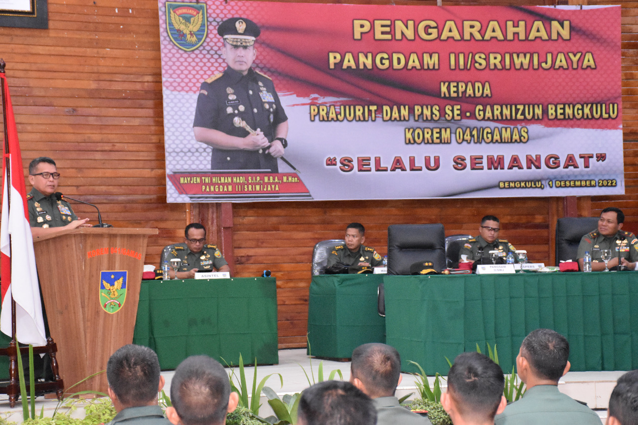Mengawali pengarahannya, Pangdam II/Sriwijaya Mayjen TNI Hilman Hadi memberikan motivasi kepada seluruh Prajurit Korem 041/Gamas untuk tetap berpegang teguh, bekerja ikhlas dan tulus dalam menjalankan tugas serta tidak lupa untuk selalu bersyukur. "Dengan selalu bersyukur, Insya Allah, kita dapat melaksanakan tugas dengan baik dan terhindar dari pelanggaran. Dengan bersyukur kita akan bahagia", kata Pangdam.