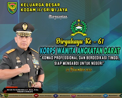 KELUARGA BESAR KODAM II/SRIWIJAYA MENGUCAPKAN DIRGAHAYU KE-61 KORPS WANITA ANGKATAN DARAT. (22 DESEMBER 2022)