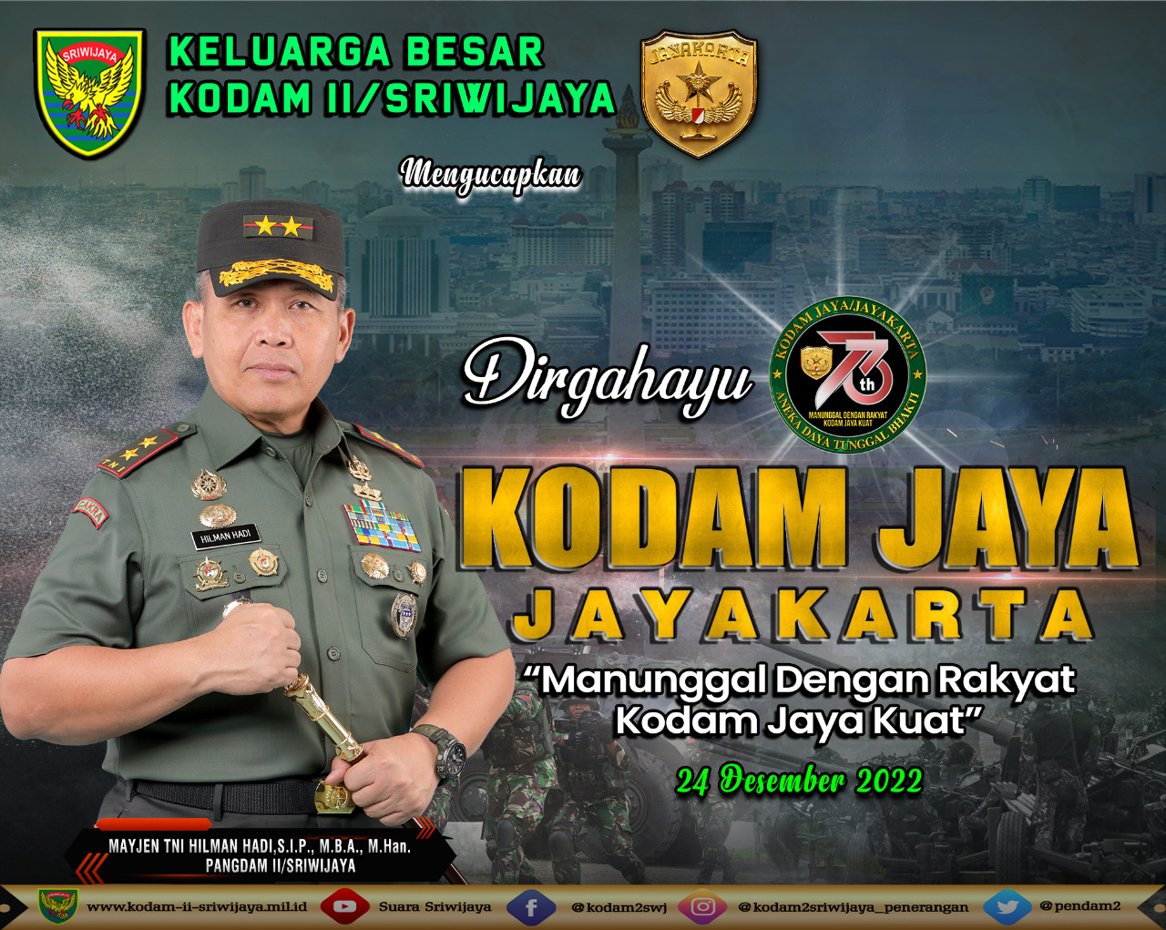 KELUARGA BESAR KODAM II/SRIWIJAYA MENGUCAPKAN DIRGAHAYU KE-73 KODAM JAYA JAYAKARTA.