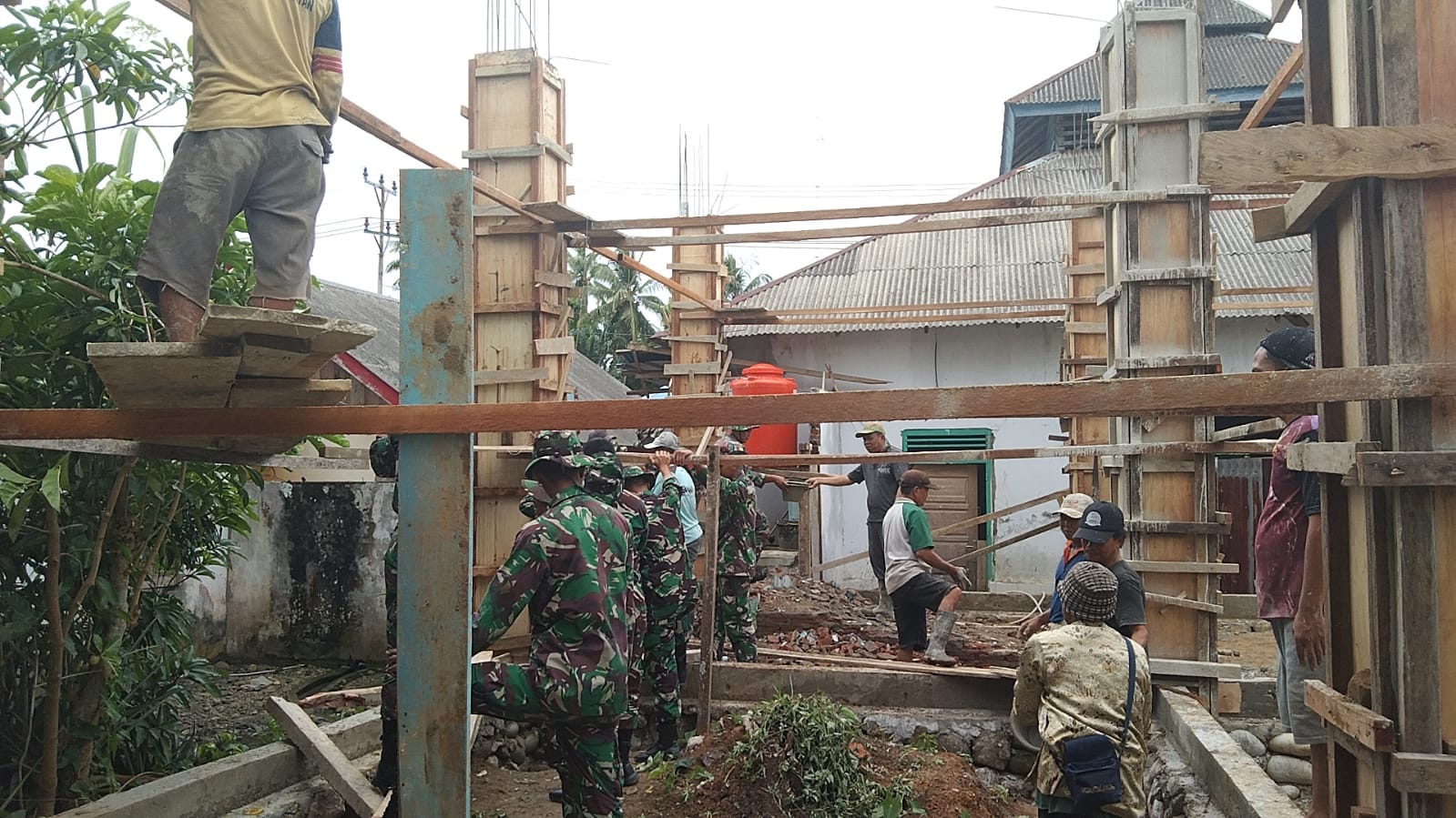 Para Prajurit Batalyon Infanteri 144/Jaya Yudha membantu warga dalam pengecoran tiang Masjid At Tohit, yang berlokasi di Desa Padang Jawi Kecamatan Bunga Mas Kabupaten Bengkulu Selatan, Selasa (31/01/2023).