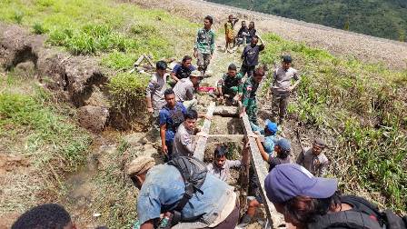 Palembang, (Pendam II/Sriwijaya) Satgas Yonif 143/TWEJ mengajak warga untuk membangun jembatan penghubung antara Kampung Mangoldoki dan Sopamikma yang telah hancur di Distrik Kiwirok, Kab. Pegunungan Bintang, Papua, Senin (20/02/2023).