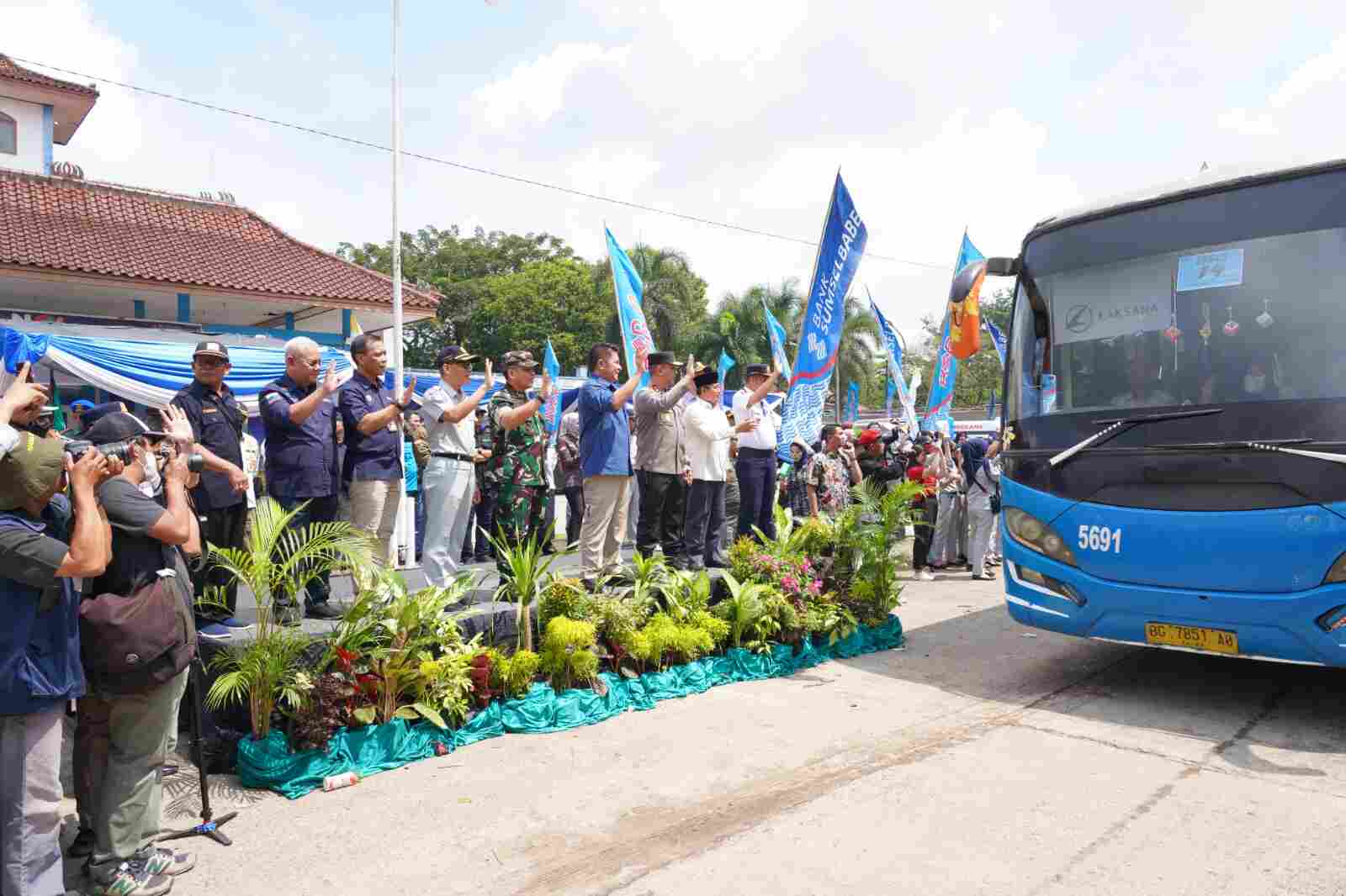 Didampingi Pangdam II/Swj dan Kapolda Sumsel, Gubernur Sumsel H. Herman Deru melepas langsung rombongan pemudik Program Mudik Gratis Angkutan Lebaran Tahun 1444 H/2023 M dengan menggunakan Bus.