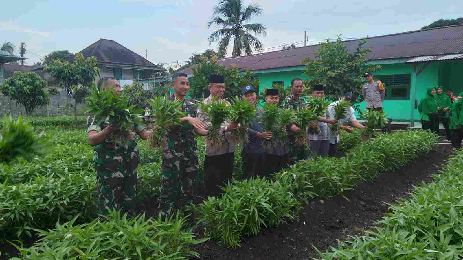 Dandim 0405/ Lahat Letkol Inf Toni Oki Priyono SIP melaksanakan panen kangkung di halaman kantor Koramil 405-07/Pulau Pinang, Rabu (19/04/2023).