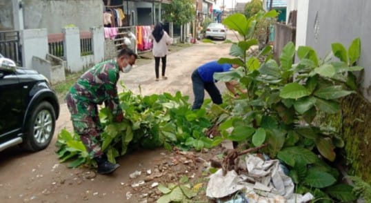 MASIH SUASANA LEBARAN PRAJURIT KODIM 0418/PALEMBANG BANTU WARGA BERSIHKAN LINGKUNGAN