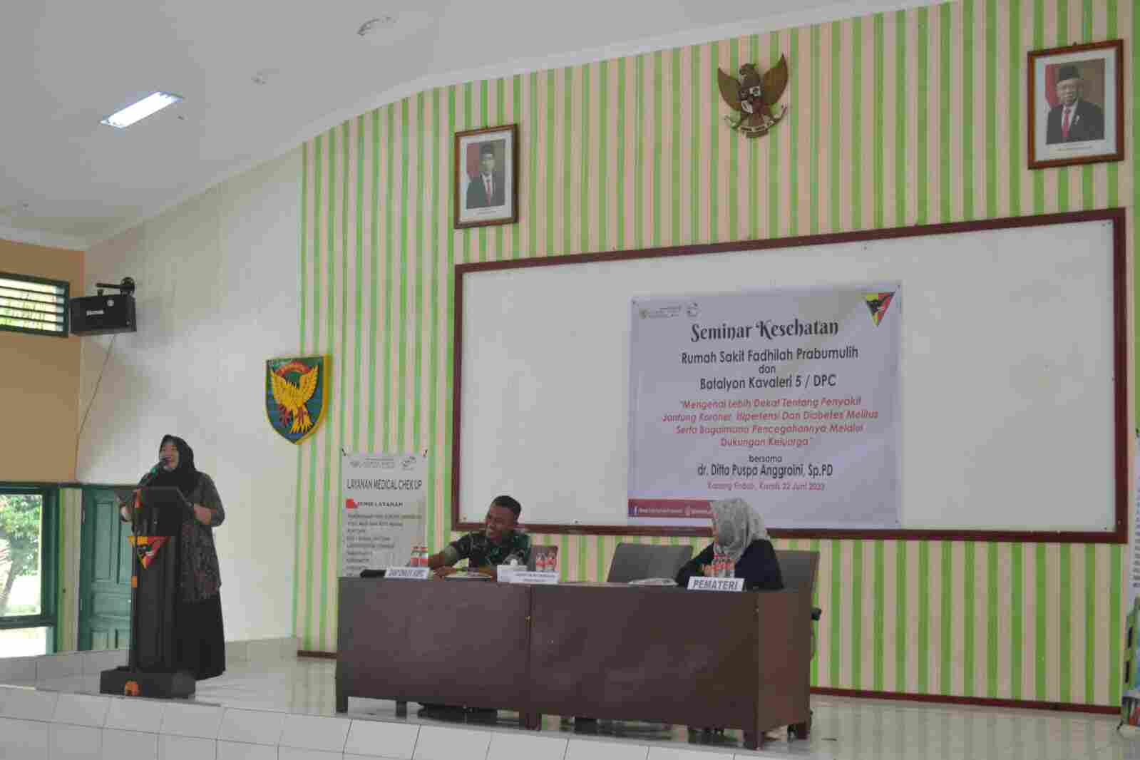 Palembang, (Pendam II/Sriwijaya) Dalam rangka mejaga kesehatan Batalyon Kavaleri 5/DPC bekerja sama dengan Rumah Sakit Fadhilah Prabumulih menyelenggarakan acara Seminar dengan tema "Mengenal lebih dekat tentang penyakit Jantung Koroner, Hipertensi, dan Diabetes Melitus, serta pencegahannya melalui dukungan keluarga, Bertempat di aula Syamsul Bahri Batalyon Kavaleri 5 Dwi Pangga Ceta, Desa Karang Endah, Kecamatan Gelumbang, Kabupaten Prabumulih, Sumatera Selatan,(22/6/2023).