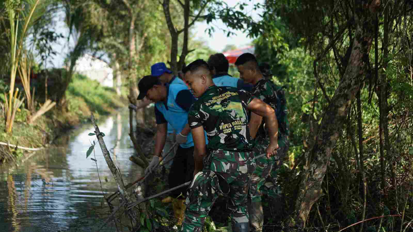 RUMPUT LIAR PENYUMBAT SALURAN AIR DIBERSIHKAN PRAJURIT YON ARHANUD 12/SBP BERSAMA WARGA