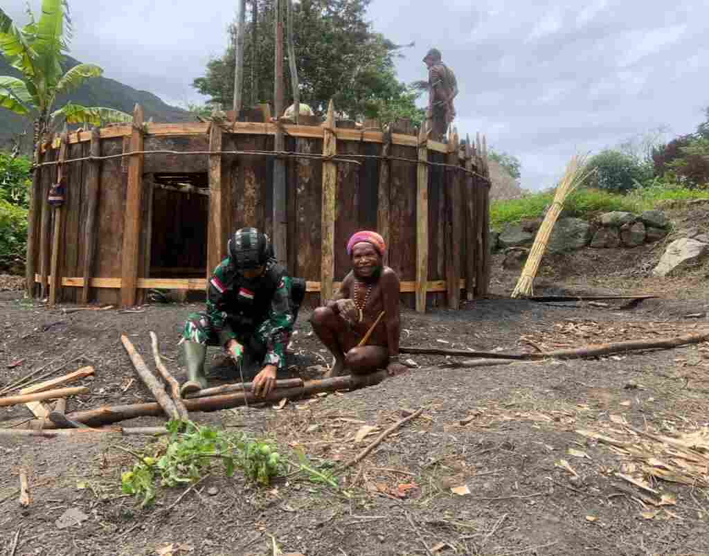 Palembang, (Pendam II/Sriwijaya) Satgas Yonif Raider 200/BN melalui Pos Kurima melaksanakan kegiatan membantu pembangunan honai milik kepala suku di Kampung Kurima, Distrik Kurima, Kab. Yahukimo, Papua Pegunungan pada hari Sabtu (02/09/2023).
