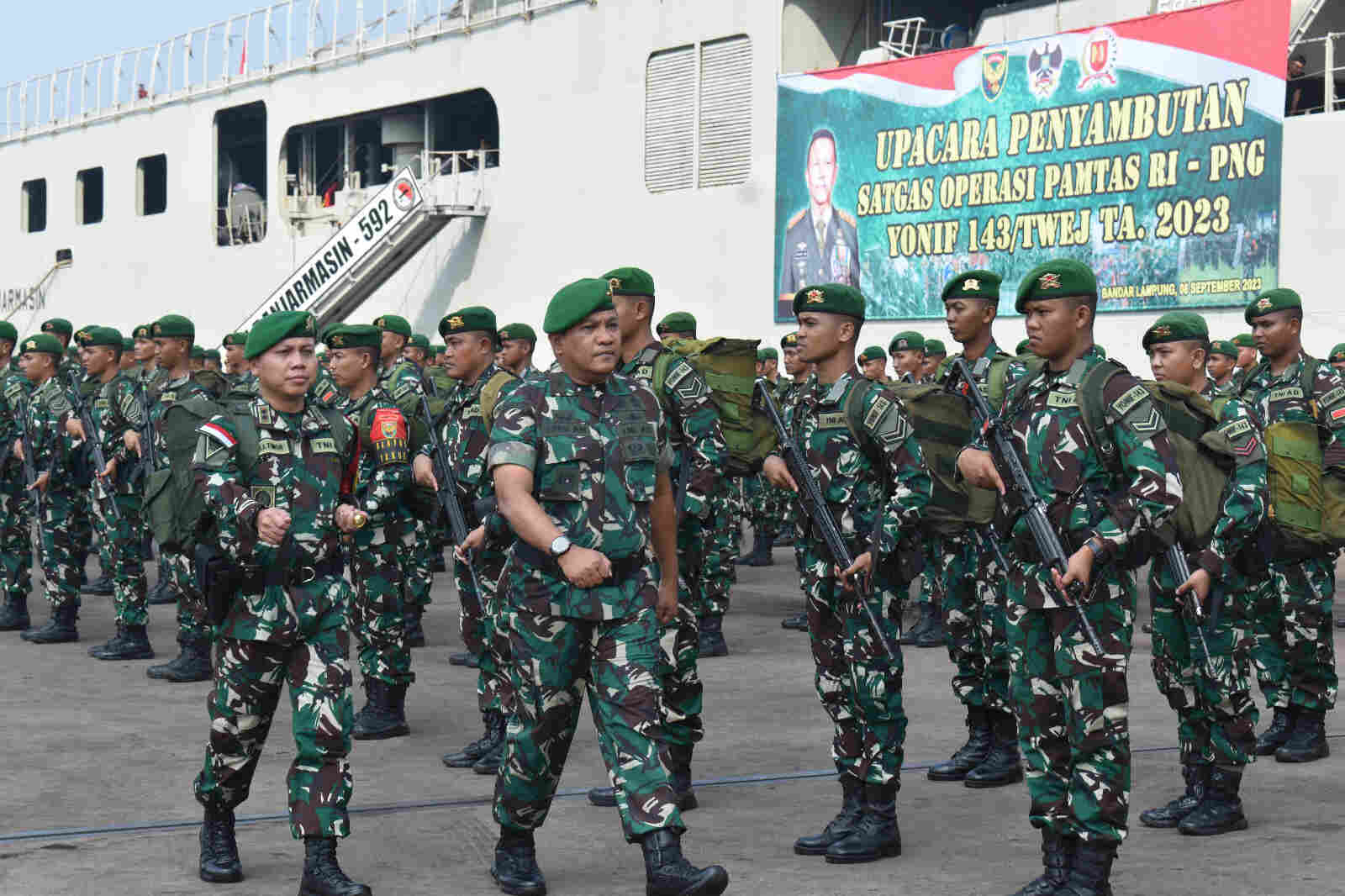 Palembang, (Pendam II/Sriwijaya). Kasdam II/Sriwijaya, Brigjen TNI Ruslan Effendy, S.I.P., memimpin langsung upacara penyambutan Satuan Tugas (Satgas) Operasi Pengamanan Perbatasan RI-PNG Sektor Utara Yonif 143/TWEJ TA 2023, bertempat di Pelabuhan Panjang Lampung, Jum’at (8/9/2023).