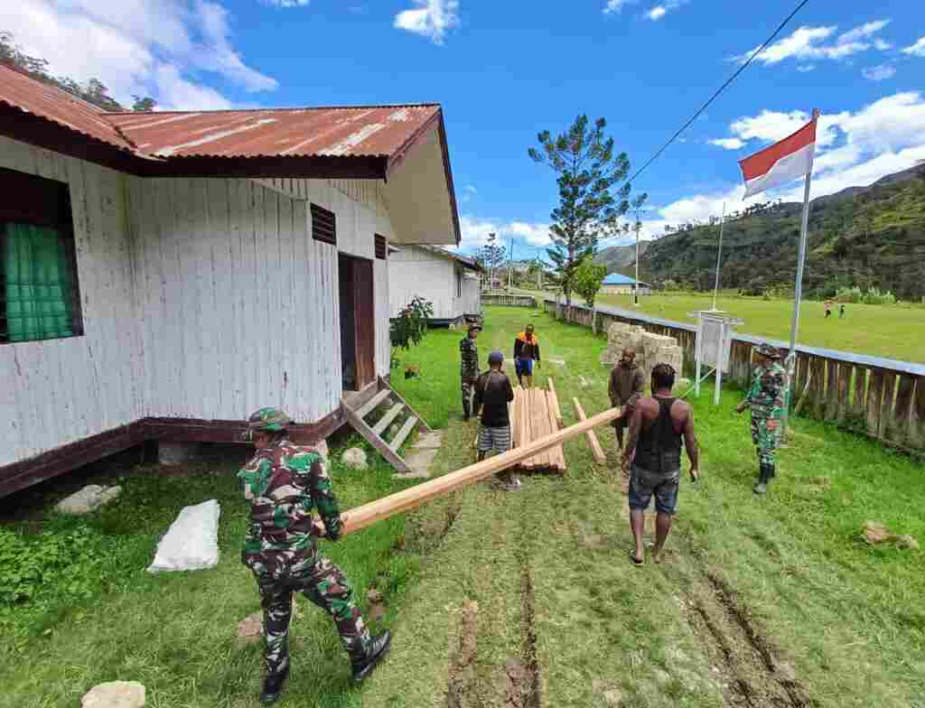 Pos Kurima Satgas Yonif Raider 200/BN bersama masyarakat melaksanakan gotong royong memperbaiki Balai KB di Puskesmas Kurima, Distrik Kurima, Kab. Yahukimo, Papua Pegunungan, Sabtu (09/09/2023).