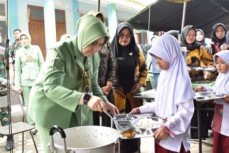 Palembang, (Pendam II/Sriwijaya). Ketua Persit Kartika Chandra Kirana (KCK) Daerah II Sriwjaya, Ny. Mila Yanuar Adil, melaksanakan kunjungan sekaligus meninjau langsung kegiatan Program Dapur Masuk Sekolah yang di gelar Kodam II/Swj bertempat di Sekolah Dasar Negeri 93 Tangga Takat Kelurahan 16 Ulu Kota Palembang, Jum'at (13/10/2023)