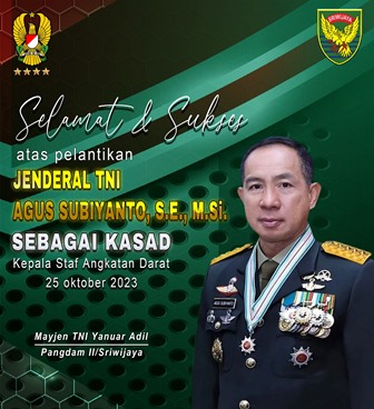 palembang, (Pendam II/Sriwijaya) SELAMAT DAN SUKSES ATAS PELANTIKAN JENDERAL TNI AGUS SUBIYANTO, S.E., M.Si., SEBAGAI KEPALA STAF ANGKATAN DARAT. (25 OKTOBER 2023)