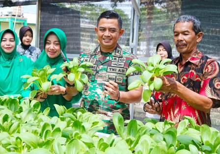 Program Hanpangan berbasis Hidroponik digalakkan oleh Dandim dengan memanfaatkan areal di sekitar Kodim 0413/Bangka pemanfaatan media hidroponik untuk menanam sayur-sayuran dinilai lebih efektif dan menghasilkan panen yang lebih melimpah serta minim gangguan hama karena tidak langsung bersentuhan dengan tanah. Dengan demikian, Dandim 0413/ Bangka dan Ketua Persit kembali menunjukkan eksistensinya terkait penguatan sistem dan strategi ketahanan pangan yang juga digalakkan oleh pimpinan, Kepala Staf TNI Angkatan Darat (Kasad). “Demi mendukung penguatan program ketahanan pangan, kita manfaatkan lahan terbatas menggunakan sistem hidroponik untuk bertanam sayur dan aneka tanaman lainnya yang menjadi komoditas kebutuhan pasar. Saat ini, kita telah panen sayur sawi, selada dan seledri, dimana tingkat panennya sangat baik dan melimpah, serta minim gangguan hama,” ujar Dandim Lebih lanjut, cara itu dapat diaplikasikan oleh masyarakat yang memiliki kemauan namun terbentur minimnya lahan untuk menyemai bibit tanaman. Sebab, pemanfaatan hidroponik dapat diterapkan pada areal ataupun lahan yang sangat minim ruang terbukanya. “Bagi masyarakat yang ingin bercocok tanam tapi lahannya minim, bisa pakai cara hidroponik saja. Lebih rapih, fleksibel dan bisa kita hindarkan kontak langsung dengan tanah. Dengan demikian, gangguan hama bisa kita tekan dan akhirnya bisa panen lebih banyak. Bila cara ini dikembangkan di tengah masyarakat secara meluas, bukan tidak mungkin kita bisa menjadi lumbung pangan di wilayah jajaran Korem 0413/Bangka, "jelasnya Pada kesempatannya Kolonel Arm Fristya Andrean Gitrias, S.H.,M,,M juga mengajak para anggota dan masyarakat untuk mengembangkan pola tanam tersebut dan menggalakkannya di tengah kehidupan bermasyarakat. “Mari bersama kita dukung ketahanan pangan di wilayah Kodim 0413/Bangka dengan mengedepankan kemandirian pangan melalui pola tanam yang lebih modern dan mudah diterapkan. Semoga apa yang kita lakukan hari ini bisa menjadi contoh baik dan ditiru masyarakat, dengan demikian, kemandirian pangan bisa kita capai seraya meredam dampak inflasi," pungkasnya.