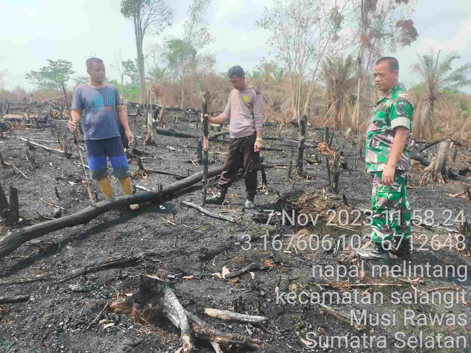 Babinsa Koramil 406-09/Terawas Sertu Zainal Arifin Bersama Warga Melaksanakan Pengecekan untuk Memastikan Padam Api Di Desa Napal Melintang, Kecamatan Selangit, Kabupaten Musi Rawas. Selasa (07/11/2023).