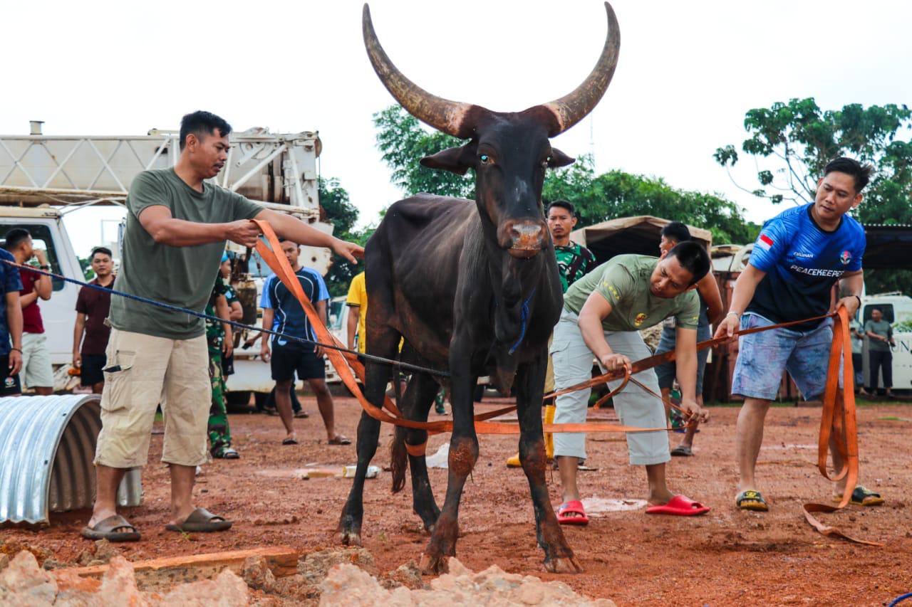 Usai pelaksanaan sholat Ied dilanjutkan dengan pelaksanaan pemotongan hewan qurban berupa 1 ekor sapi dan 13 ekor kambing dilanjutkan membagikan daging qurban oleh panitia kepada seluruh personel dan juga masyarakat sekitar yang dipimpin langsung oleh Wadansatgas Mayor Czi Hary Nugroho.