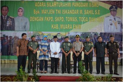Palembang, (Pendam II/Swj). Pangdam II/Swj Mayor Jenderal TNI Iskandar M. Sahil, SE beserta Istri Umi Amborowati Iskandar, didampingi Aster Kasdam II/Swj, Aspers Kasdam II/Swj dan Kapendam II/Swj melakukan kunjungan kerja dan silaturrahmi dengan Bupati Muara Enim Ir. Muzakir Sai Sohar dan FKPD serta segenap komponen mkasyarakat Kabupaten Muara Enim, Jum’at (6/3/15).