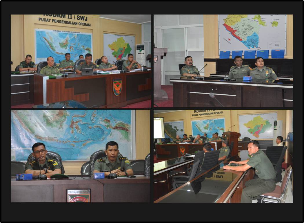 Palembang, (Pendam II/Swj). Wakil Komandan Rindam II/Swj Letkol Inf M Soleh mewakili Danrindam II/Swj Kolonel Inf Joko Purwo Putranto, Senin (1/6/2015) memaparkan rencana latihan pratugas Satuan Tugas Pengaman Perbatasan (Satgas Pamtas) RI-Papua Nugini, Yonif 142/KJ Rem 042/Gapu Kodam II/Swj kepada Paban IV/Ops Staf Operasi Mabes TNI Kolonel Inf Trimartono, melalui video conference bertempat di ruang Puskodal Ops Kodam II/Swj, Palembang.