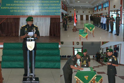 Ketujuh pejabat Kodam yang diserah terimakan tersebut yakni Jabatan Staf Ahli Pangdam II/Swj Bidang Ekonomi dari Kolonel Inf Khaerully kepada Kolonel Inf Jahidin Chilo, S.IP., M.Si., LO TNI AU Kodam II/Swj dari Kolonel Lek Rusdijal Rusly kepada Letnan Kolonel Tek Azuarsjah, S.E., M.Si., Kainfolahtadam II/Swj dari Kolonel Inf Jahidin Chilo, S.IP., M.Si., kepada Kolonel Inf Gustia Wardana, Kabintaldam II/Swj dari Kolonel Inf Gustia Wardana kepada Letnan Kolonel Inf Suswanto. Selain itu juga diserahterimakan jabatan Kabekangdam II/Swj dari Kolonel Cba Akhmad Muzamil kepada Kolonel Cba Rustam Rajab Bajuri, S.E., Dandenmadam II/Swj dari Letnan Kolonel Inf Maulana Ridwan kepada Letnan Kolonel Inf Rachmad dan penyerahan tugas Kapuskodaldam II/Swj dari Pangdam II/Swj kepada Letnan Kolonel Inf Heri Dwi Subagyo. Dalam amanatnya, Pangdam antara lain menyampaikan bahwa alih tugas ataupun serah terima jabatan merupakan hal yang wajar dan biasa, sebagai bagian dari proses dan dinamika pembinaan organisasi, sekaligus regenerasi dan kesinambungan kepemimpinan, dalam rangka mendorong semangat pembaruan dan penyegaran pemikiran, yang diproyeksikan bagi peningkatan kualitas kinerja organisasi, guna menjamin dan mengoptimalkan keberhasilan tugas satuan dalam mendukung tugas pokok Kodam II/Swj. Jabatan sambung Pangdam merupakan amanah dan setiap amanah harus dapat dipertanggungjawabkan, tidak hanya kepada pimpinan dan satuan, tetapi juga harus dipertanggungjawabkan kepada Tuhan Yang Maha Kuasa. Oleh karenanya, amanah jabatan ini harus dilaksanakan dengan penuh rasa tanggung jawab, rasa syukur, keikhlasan, kejujuran dan dedikasi yang tinggi, serta komitmen yang kuat untuk senantiasa berbuat yang terbaik. Dikatakan Panglima bahwa sebagai pimpinan, para Perwira harus berfikir kreatif dan inovatif, untuk menciptakan perubahan dan perbaikan menuju kearah yang semakin baik bagi satuan yang dipimpinnya, tidak berpikir datar atau biasa-biasa saja. Perwira harus mampu melaksanakan tugas secara maksimal dan melakukan sesuatu yang luar biasa. “Laksanakan setiap perintah yang diberikan dengan penuh totalitas, ketulusan dan maksimal”, tandasnya. Hadir dalam acara tersebut, Kasdam II/Swj Brigjen TNI Komaruddin Simanjuntak S.IP, Irdam II/Swj, Danrem 044/Gapo, Para Staf Ahli Pangdam II/Swj, Para Asisten dan Dan/Ka Balakdam II/Swj, LO AL dan LO AU Kodam II/Swj, Ketua dan Wakil Ketua beserta para Pengurus Persit Kartika Chandra Kirana PD II/Swj.