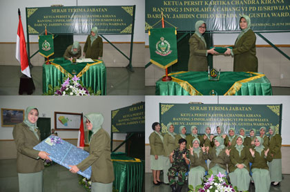Hal ini disampaikan Ketua Persit Kartika Chandra Kirana Cabang VI PD II/Swj Ny. Dedi Yusniar dalam sambutannya, Jum’at (26/6/15) ketika memimpin acara Serah Terima Jabatan Ketua Persit Kartika Chandra Kirana Ranting 3 Infolahta Cabang VI PD II/Swj dari Ny. Jahidin Chilo kepada Ny. Gustia Wardana, bertempat di Gedung Gatot Subroto Makodam II/Swj Palembang. Pada kesempatan itu, Ny. Dedi Yusniar mengingatkan bahwa anggota Persit dituntut untuk bijak dan pandai dalam mengatur waktu dan memanfaatkan setiap kesempatan yang ada serta meningkatkan pengetahuan, keterampilan, wawasan dan kedewasaan dalam berpikir dan bersikap, sehingga semua peran yang kita emban tersebut dapat berjalan secara seimbang dan serasi, bahkan mampu saling melengkapi antara satu dengan yang lainnya. “Mari kita bersama-sama menjadikan organisasi Persit yang kita cintai ini sebagai wahana pembelajaran, komunikasi dan berbagi pengalaman, sehingga menjadi tambahan bekal dalam bertugas,” tandas istri orang nomor satu di Kodam II/Swj ini. “Selain itu, yang tidak kalah penting adalah meningkatkan keimanan dan ketakwaan, serta memperkuat ketahanan moral, mental dan spiritual, sebagai perisai dan pedoman kita dalam menjalani kehidupan ini. Serah terima ini ditandai dengan penandatanganan naskah serah terima jabatan dan penyerahan memorandum, serta dihadiri Para Ketua Cabang dan Ranting sejajaran Persit Kartika Chandra Kirana PD II/Sriwijaya dan segenap anggota Persit Kartika Chandra Kirana Ranting 3 Infolahta Cabang VI PD II/Swj.