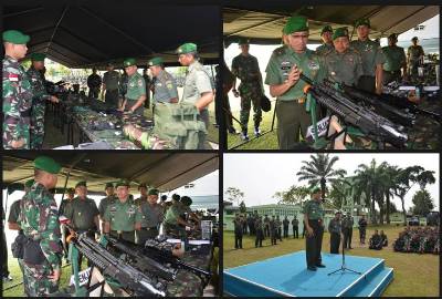 Korem 042/Gapu Wakil Asisten Operasi (Waasops) Kasad Brigjen TNI Muslimin Akib. SE. MM mengecek kesiapan Satgas Yonif 142/Ksatria Jaya yang akan melaksanakan tugas pengamanan perbatasan RI-PNG, berlangsung di Yonif 142/KJ, Jum’at (10/7).