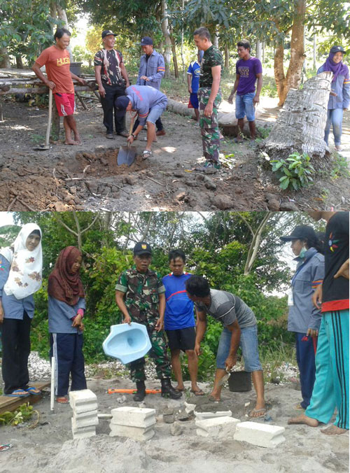 Lepar Pongok (Penrem 045/Gaya) Anggota Koramil 1403-01/ Lepar Pongok bersama mahasiswa Universitas Bangka Belitung dan masyarakat melaksanakan kerja bhakti pembangunan jamban minggu 02/08.