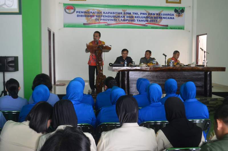 Kegiatan bertujuan untuk memberikan wawasan khususnya kepada Keluarga prajurit dan PNS TNI sekaligus untuk mendukung program Pemerintah menggalakkan Keluarga Berencana di wilayah Provinsi Lampung sehingga tercipta keluarga kecil yang bahagia dan sejahtera terutama kepada masyarakat Lampung. Dalam sambutan Komandan Korem 043/Gatam, Kolonel Arm Winarto, M. Hum yang dalam hal ini dibacakan oleh Pjs. Kasi Ter Korem 043/Gatam, Mayor Inf Prabowo, secara tertulis Danrem menyampaikan bahwa program pembangunan penduduk dan pembangunan Keluarga Berencana merupakan bagian dari program pembangunan nasional yang harus dilaksanakan dengan melibatkan partisipasi berbagai semua pihak. Dengan demikian keberhasilan program kependudukan dan Keluarga Berencana sangat ditentukan oleh partisipasi seluruh lapisan masyarakat, dan tidak terlepas juga dukungan dari seluruh jajaran TNI yang ada di semua tingkatan di wilayah Provinsi Lampung khususnya, terang Danrem dalam sambutannya. Disampaikan pula oleh Danrem bahwa Sejarah telah mencatat TNI merupakan mitra kerja yang sangat potensial dalam mempercepat pencapaian keberhasilan program pembangunan penduduk dan program Keluarga Berencana. Ini terbukti bahwa,P rajurit TNI dapat menjangkau sampai kesasaran, terutama kedaerah-daerah terpencil dan tertinggal dengan cara mendekatkan danmemberikan pelayanan program Keluarga Berencana kepada Masyarakat. Danrem berharap kepada para peserta acara agar memanfaatkan kesempatan ini dengan sebaik–baiknya, guna waktu yang ada untuk menyerap segala materi yang disampaikan oleh Tim dari BKKBN, sehingga diharapkan sekembalinya dari mengikuti kegiatan ini, para anggota sekalian dapat memberikan pengetahuan dan penjelasan kepada seluruh anggota di satuan masing–masing, harapnya.