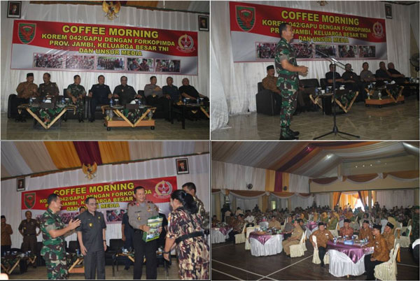 Kegiatan yang berlangsung di Balai Prajurit Korem 042/Gapu tersebut di hadiri oleh Pj Gubernur Jambi Drs. Irmansyah, Danrem 042/Gapu Kol Inf Makmur,S.AP,. M.M, Kapolda Jambi Brigjen Pol Drs.Luthfi Lubihanto, Ketua DPRD Provinsi Jambi dan Unsur Forkopimda. Dalam sambutan Danrem mengatakan, Coffee Morning merupakan acara untuk Korem yang dilaksanakan tiap bulan, untuk mempererat tali silaturahmi. "Dalam acara ini mari kita bersama membangun Jambi. Intinya hari ini komunikasi interaktif," ujar Danrem dalam sambutannya. Acara diakhiri dengan pemberian cindera mata secara simbolis oleh Kapolda Jambi dan Pj Gubernur Provinsi Jambi dan didampingi Danrem 042/Gapu, berupa dasar kain untuk seragam FKPPI yang baru dan photo bersama.