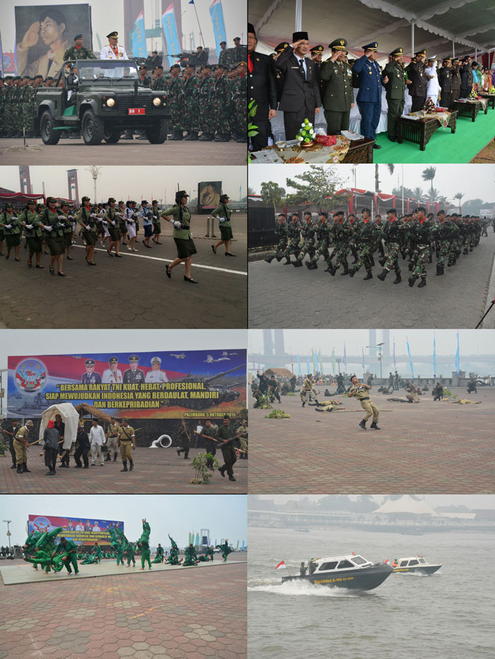Upacara ini diikuti sekitar 1.617 personel terdiri dari 1 SSK kelompok Perwira Menengah (Pamen), 1 SSK kelompok Perwira Pertama (Pama), 2 SST kelompok Wanita TNI, 1 SSK gabungan POM TNI AD, AL dan AU, dan 1 SSY Yonif 200/Raider. Kemudian pasukan dari Yonkav 5/Serbu, Yon Armed 15/76, Raiarhanudri 41/BS, Yonzipur 2/SG, Lanal dan Lanud Palembang masing-masing 1 SSK. Selain itu juga diikuti 1 SSK pasukan dari Polri, barisan kelompok PNS Gabungan TNI baik putra maupun putri masing-masing 1 SSK, serta SSK Gabungan dari PPM, FKPPI dan Menwa. Selepas pelaksanaan upacara, sejumlah atraksi ditampilkan antara lain ; Defile dari seluruh peserta upacara beserta kendaraan/Alutsista. Tidak ketinggalan juga diramaikan Defile abang tukang becak. Kemudian dilanjutkan dengan Sailing Pass kendaraan angkutan air dari TNI AD dan AL serta perahu tradisional masyarakat Palembang bertempat di Sungai Musi. Selain itu juga dilaksanakan Demonstrasi Bela Diri Militer Yong Moodo, demonstrasi ini dilakukan guna meningkatkan keterampilan prajurit dalam teknik beladiri militer dengan baik, sedangkan gerakan yang ditampilkan adalah Yong Hobob, Gibon, Sasu, teknik jatuh, Teknik melompat dan perkelahian tanpa alat. Bukan hanya itu, Sosio Drama Kolosal Panglima Besar Jenderal Sudirman yang melibatkan sedikitnya 610 orang dari kalangan prajurit TNI, PNS mahasiswa, pelajar, anak-anak dan masyarakat, juga berhasil memukau masyarakat Sumsel yang hadir pada saat itu. Drama kolosal ini berkisah bagimana kegigihan dan semangat Jenderal Soedirman yang memimpin pasukan gerilya melawan penjajah. Padahal, saat itu Panglima besar ini dalam kondisi sakit. Meski ditandu, Jenderal Soedirman tetap meminta restu kepada Presiden untuk berperang dengan cara gerilya, hingga akhirnya berhasil merebut kemerdekaan. Perang gerilya ini dilakukan oleh Jenderal Soedirman saat serangan Agresi Militer kedua Belanda yang menghancurkan Ibu Kota RI pada saat itu, Yogyakarta pada tahun 1948. Kegiatan dilanjutkan dengan acara syukuran. HUT ke-70 TNI kali ini mengangkat tema ; “Bersama Rakyat TNI Kuat, Hebat, Profesional, Siap Mewujudkan Indonesia yang Berdaulat, Mandiri dan Berkepribadian.” Tema ini merefleksikan niat, tekad, dan semangat patriotik serta profesionalisme prajurit TNI untuk berbuat dan berkarya yang lebih baik, lebih berkualitas, dan lebih berkapasitas dalam bingkai NKRI.