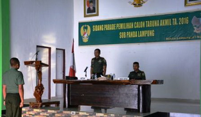 Pelaksanaan seleksi calon Taruna dari awal hingga kegiatan parade dilaksanakan secara objektif dan transparan, keguatan ini dilakukan untuk mencari bibit-bibit prajurit yang berkualitas dan mutlak, guna menjamin proses regenerasi Prajurit TNI AD, agar tetap relevan sesuai dengan perkembangan jaman. Untuk itu, proses seleksi terus dilakukan agar berjalan lebih efektif dalam menjaring generasi muda yang memiliki atensi tinggi dan berpotensi masuk menjadi prajurit. Semakin selektif dalam memilih calon prajurit, maka akan semakin signifikan dalam membangun kekuatan TNI AD karena kegiatan ini bernilai Strategis untuk memperbaiki kualitas Sumber Daya Manusia, Sidang Parade Calon Taruna Akmil TA. 2016 yang dilaksanakan diikuti 27 Orang Calon Taruna Akmil TNI-AD dari 31 jumlah peserta yang mendaftar. Berdasarkan laporan dan data yang diberikan oleh Tim Seleksi Penerimaan Calon Taruna Akademi TNI-AD TA. 2016 Sub Panda Lampung, bahwa penerimaan pendaftaran Calon Taruna dengan animo pendaftar berjumlah 31 orang. Setelah dilaksanakan cek awal mulai dari pemeriksaan Administrasi, Kesehatan dan Jasmani yang mengikuti sidang parade sebanyak 27 orang. Akhirnya, setelah Acara Sidang Parade selesai ditetapkan calon Taruna untuk mengikuti tes selanjutnya sebanyak 7 orang. Sidang Parade Calon Taruna Akmil TA. 2016 dihadiri pula Kasrem 043/Gatam, Letnan Kolonel Utten Simbolon, Dandenkesyah Rem 043/Gatam, Para Kasi Korem 043/Gatam, Ka Ajenrem 043/Gatam dan Kajasrem 043/Gatam.