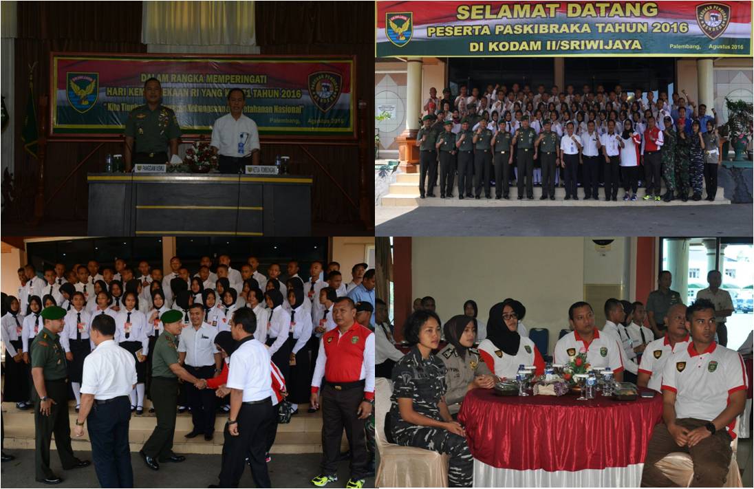 Palembang, (Pendam II/Swj). Pangdam II/Swj Mayjen TNI Sudirman S.H, M.H, Rabu (3/8/2016) menerima kunjungan 50 peserta Pasukan Pengibar Bendera Pusaka (Paskibraka) Provinsi Sumsel beserta 22 orang pendamping yang dipimpin oleh Kadispora Provinsi Sumsel Bpk. H. Ahmad Yusuf Wibowo, bertempat di gedung Jenderal Sudirman Makodam II/Swj Palembang.