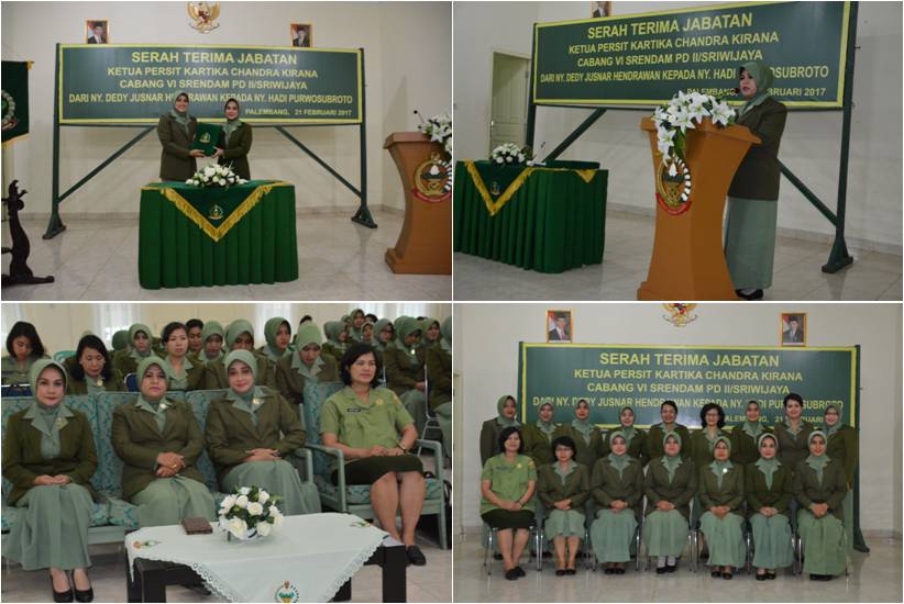 Untuk itu, Ketua Persit Kartika Candra Kirana Daerah II/Swj Ny. Lucy Sudirman menghimbau para istri prajurit Kodam II/Swj agar selalu memberikan dukungan dan motivasi suami saat menjalankan tugasnya. Himbauan tersebut diungkapkan Ketua Persit KCK PD II/Swj Ny. Lucy Sudirman dalam sambutannya ketika memimpin Serah Terima Jabatan Ketua Persit Kartika Chandra Kirana Cabang VI Srendam PD II/Sriwijaya dari Ny. Dedy Jusnar Hendrawan kepada Ny. Hadi Purwo Subroto, Selasa (21/02/2017) bertempat di Aula Persit PD II/Swj Jl. Manunggal Palembang. “Dukung dan beri motivasi suami kita secara tulus, ikhlas dan penuh kasih sayang dalam setiap pelaksanaan tugas yang diembannya”, ujar Ny. Lucy. Dikatakan Ny. Lucy bahwa, keberadaan organisasi Persit adalah dalam rangka mendukung pencapaian tugas pokok satuan, dimanapun suami kita berada dan mengabdi. “Oleh sebab itu, kita harus memberikan dukungan penuh, tulus dan ikhlas kepada satuan melalui pembinaan istri prajurit beserta keluarganya”, tutur istri orang nomor satu di Kodam II/Swj ini. Pada kesempatan tersebut, Ny. Lucy mengucapkan terima kasih dan penghargaan yang tulus kepada Ibu Dedy Jusnar Hendrawan yang telah melaksanakan tugas dan tanggung jawabnya dalam memimpin organisasi Persit Kartika Chandra Kirana Cabang VI Srendam PD II/Sriwijaya dengan baik. Termasuk ucapan selamat kepada Ibu Hadi Purwo Subroto, atas kepercayaan yang diberikan untuk mengemban amanah jabatan sebagai Ketua Persit Kartika Chandra Kirana Cabang VI Srendam PD II/Sriwijaya yang baru. Untuk diketahui, acara serah terima jabatan ini merupakan bagian dari rangkaian kegiatan serah terima jabatan Asrendam II/Sriwijaya dari Bapak Kolonel Arm Dedy Jusnar Hendrawan kepada Bapak Kolonel Inf Hadi Purwo Subroto, yang telah dilaksanakan beberapa saat yang lalu. Dengan pergantian tersebut, maka secara otomatis diikuti serah terima jabatan Ketua Persit Kartika Chandra Kirana Cabang VI Srendam PD II/Sriwijaya. Pelaksanaan Sertijab ini ditandai dengan penandatanganan naskah serah terima jabatan dan penyerahan memorandum oleh pejabat lama dan baru. Turut hadir Wakil Ketua Persit PD II/Swj Ny. Arnida M. Taufiq, Para Ketua dan Pengurus serta anggota Persit Koorcab, Cabang, dan Ranting Sejajaran Daerah II/Swj.