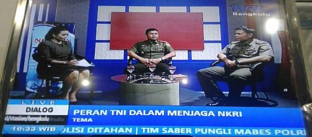 Bengkulu, (Penrem 041/Gamas) Sebagai salah satu langkah lebih mendekatkan diri ke masyarakat, Korem 041/Gamas dan Kodim 0407/Bkl bekerjasama dengan TVRI Bengkulu melaksanakan kegiatan dialog interaktif dengan tema "PERAN TNI DALAM MENJAGA NKRI" di studio TVRI Bengkulu (Selasa, 21/2)