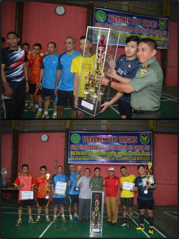 Bengkulu, (Penrem 041/Gamas) Danrem 041/Gamas menutup Turnamen Bulu tangkis Rektor UMB dan Danrem Cup di Gedung JM Sawah Lebar Bengkulu, serta Penyerahan penghargaan terhadap para juara dilakukan oleh Rektor UMB H. Ahmad Dasan, S.H, M.A dan Komandan Korem 041/Gamas Kolonel Inf Andi Muhammad. Senin (13/3/17)