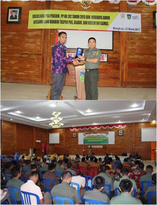 Tatap muka atau Komsos (Komunikasi Sosial) merupakan salah satu metode pembinaan teritorial sebagai sarana untuk mencapai kesepahaman dan persepsi tentang pemberdayaan wilayah pertahanan di Darat dengan seluruh Komponen Bangsa, termasuk keluarga besar TNI. Tatap muka atau komsos antar Prajurit Korem 041/Gamas dengan Keluarga Besar memiliki arti penting sebagai upaya memelihara hubungan antara prajurit Korem 041/Gamas dengan keluarga besar TNI yang lebih harmonis serta menggugah dan mengajak keluarga besar TNI untuk berpartisipasi menyikapi dan mengatasi permasalahan bangsa. Saya mengajak seluruh komponen keluarga besar TNI yang ada di wilayah Korem 041/Gamas agar jangan terlena dengan perubahan lingkungan dan politik yang diakibatkan pengaruh proses globalisasi dan arus informasi yang begitu cepat dan berdampak luas terhadap dinamika kehidupan bermasyarakat, berbangsa dan bernegara. Di akhir sambutannya, Danrem 041/Gamas mengajak KBT tetap menjalin hubungan yang lebih harmonis antara Korem 041/Gamas dengan keluarga besar TNI guna mendukung tugas pokok TNI AD, menyamakan persepsi dan pemahaman keluarga besar TNI tentang fenomena bahaya laten komunis saat ini, mewujudkan kesamaan visi dan misi dalam kehidupan berbangsa dan bernegara sehingga sinergitas antara Prajurit Korem 041/Gamas dengan keluarga besar TNI dapat mengatasi permasalahan bangsa dan negara. Di sela-sela acara tatap muka, dilanjutkan dengan acara Sosialisasi Pra Pensiun PP No.182 tahun 2015 dan Budidaya jamur bersama Bank Mandiri Taspen Pos ASABRI dan Korem 041/Gamas. Pada kerjasama tersebut, Bank Mantap akan mendukung ASABRI dalam mengelola seluruh program Pensiunan TNI/Polri, yakni Manfaat Program Hari Tua, Jaminan Kecelakaan Kerja, Jaminan Kematian termasuk Nilai Tunai Iuran Pensiunan TNI/Polri dan PNS di Lingkungan Kementerian Pertahanan dan Kepolisian Negara RI. Untuk mengoptimalisasi manfaat yang bisa dinikmati para pensiunan TNI/Polri, Bank Mantap juga akan menyediakan layanan seperti fasilitas non-setoran awal, fasilitas ATM untuk penarikan uang pensiun serta keikutsertaan dalam program undian yang diselenggarakan oleh Bank Mantap. Menurut Irawan Sumardi sinergi ini merupakan implementasi keseriusan Bank Mandiri Taspen Pos ASABRI dalam menghadirkan layanan keuangan yang menguntungkan para pensiunan di Indonesia sehingga dapat menikmati masa pensiun dengan nyaman dan tenang. Sebagai lembaga keuangan milik bangsa Indonesia, kami berkomitmen untuk menunjukkan apresiasi kepada para pensiunan anggota TNI/Polri dan yang telah usai mengabdi bagi Negeri ini melalui pelayanan keuangan yang handal dan terbaik ” ungkap Irawan Sumardi. Irawan Sumardi menambahkan, pihaknya optimis dapat memberikan layanan keuangan yang menguntungkan para pensiunan mengingat dukungan perusahaan induk, yakni Bank Mandiri Taspen Pos ASABRI yang memiliki jaringan luas dan produk keuangan yang bervariasi, serta PT Taspen telah berpengalaman dalam memahami pola dan kebutuhan pensiunan.
