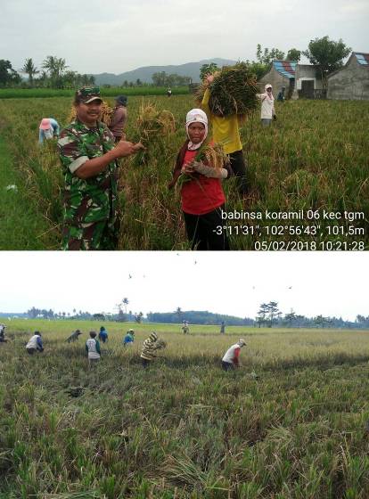 Penrem 044/Gapo, Bertempat di persawahan Desa Upang Mulia Kec. Makarti Kab. Banyuasin, Bintara Pembina Desa (Babinsa) Koramil 401-06/Sungsang Serda Andy Purnomo melaksanakan Upsus pendampingan panen padi jenis Mikongga Ciherang Jumbo dan IR 64 seluas 45 hektare, dengan hasil panen 5-6 ton gabah kering giling (GKG) per hektare, Senin (5/2/2018).