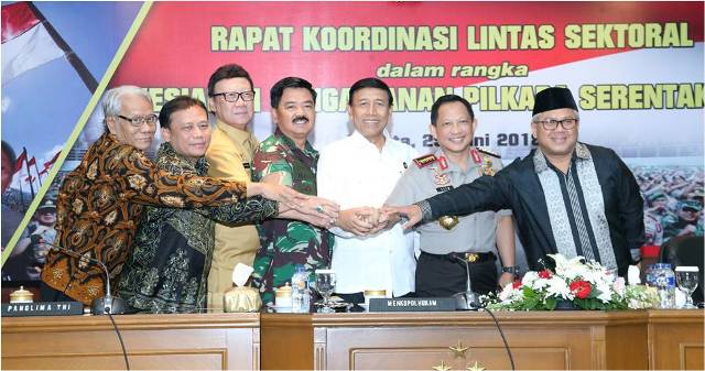 (Puspen TNI). Dalam rangka pengamanan Pilkada Serentak tahun 2018, TNI siap menjaga keamanan jalannya Pilkada dan menjaga netralitas. Demikian dikatakan Panglima TNI Marsekal TNI Hadi Tjahjanto, S.I.P didampingi Kapolri Jenderal Pol Prof. H.M Tito Karnavian, Ph.D., Menteri Koordinator Bidang Politik, Hukum dan Keamanan (Menko Polhukam) RI Jenderal TNI (Purn.) Dr. H. Wiranto, S.H, Menteri Dalam Negeri (Mendari) Tjahjo Kumolo, S.H., Ketua KPU RI Arief Budiman, Ketua Bawaslu RI Abhan Misbah dan Ketua YKPP Mayjen (Purn) Bambang Hermanto pada acara rapat koordinasi lintas sektoral dalam rangka kesiapan pengamanan pilkada serentak 2018, bertempat di Ruang Rapat Utama (Rupatama) Mabes Polri, Jakarta, Senin (25/6/2018).