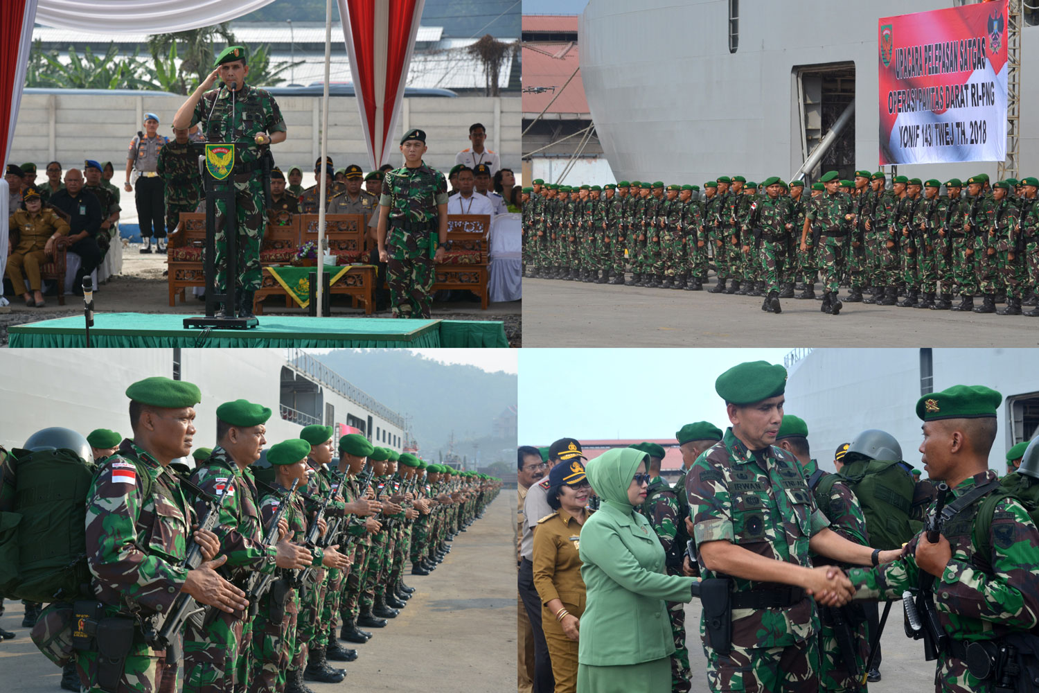 Palembang. (Pendam II/Swj), Pangdam II/Sriwijaya, Mayjen TNI Irwan, S.I.P., M. Hum., memberangkatkan 450 prajurit Yonif 143/TWEJ yang tergabung dalam Satuan Tugas Pengamanan Perbatasan (Satgas Pamtas) Darat yang akan bertugas menjaga pertahanan di wilayah perbatasan Republik Indonesia – Papua Nugini, Senin (27/8/2018) bertempat di Dermaga Pelabuhan Panjang, Provinsi Lampung.