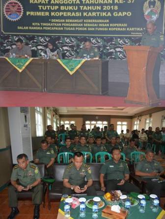 Penrem 044/Gapo, Primer Koperasi Kartika Gapo yang berada di Markas Komando Resor Militer (Korem) 044/Gapo menggelar Rapat Anggota Tahunan (RAT) Tutup Buku Tahun 2018, dengan mengambil tema ”Dengan semangat kebersamaan kita tingkatkan pengabdian sebagai insan Koperasi dalam rangka pencapaian tugas pokok dan fungsi Koperasi Kartika” bertempat di Balai Prajurit Makorem 044/Gapo Jln. Jenderal Sudirman KM. 4,5 Palembang, Kamis (14/2/2019).