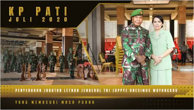 Dalam kegiatan KP PATI tersebut selain melantik beberapa perwira tinggi TNI AD juga sebagai perpisahan dengan perwira tinggi yang telah memasuki masa purna. Salah satunya adalah Letjen TNI Joppye Onesimus Wayangkau yang sudah memasuki masa purna-nya. “Saya mengucapkan terima kasih atas kepercayaan yang diberikan TNI AD kepada saya untuk menangani Pusat Teritorial Angkatan Darat sebelum saya memasuki masa purna ini,” ujar Letjen TNI Joppye. Lika-liku kehidupan yang ditempuh oleh beliau tidak mematahkan semangat, tahap demi tahap Pendidikan dijalaninya. Meski dijuluki sebagai perwira yang sangar dan galak oleh para juniornya, beliau melakukan hal tersebut dengan niat baik untuk mengajarkan sikap disiplin dan patuh. “Memulai karir sebagai seorang prajurit TNI AD, saya mengawalinya dari meniti karir sebagai perwira pertama sampai dengan saat terakhir sebagai Letnan Jenderal. ini merupakan suatu kepercayaan yang luar biasa untuk saya,” ujar Letjen TNI Joppye. Di balik kesuksesan yang beliau raih, terdapat sosok yang selalu mendukung setiap perjalanannya. Baik saat keadaan terpuruk hingga sukses hingga akhir masa jabatan ini. Beliau adalah Istriyani Wayangkau, istri dari Letjen TNI Joppye Onesimus Wayangkau. “Saya atas nama pribadi dan keluarga mengucapkan terima kasih yang sebesar-besarnya, atas kepercayaannya terhadap kinerja bapak Joppye Onesimus Wayangkau sebagai Pangdam dan lanjut sebagai Danpusterad,” ujar Istriyani Wayangkau. #TNIADMengabdiDanMembangunBersamaRakyat