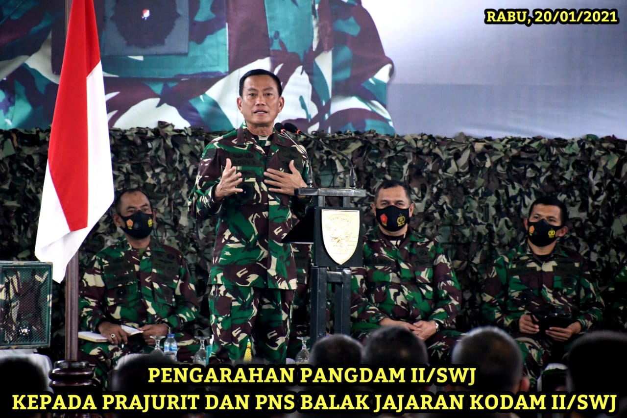 Panglima Kodam II/Sriwijaya Mayjen TNI Agus Suhardi, memberikan pengarahan kepada para Prajurit dan PNS Badan Pelaksana Kodam (Balakdam) II/Sriwijaya wilayah Garnizun Palembang, Rabu (20/1/2021) bertempat di Lapangan Tenis Markas Zidam II/Swj Jl. Talang Keranggo No. 2 Kelurahan Talang Semut Kecamatan Bukit Kecil Kota Palembang.