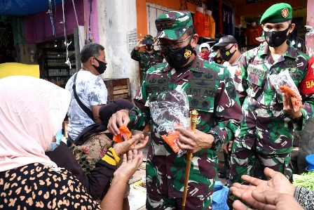 Palembang, (Pendam II/Sriwijaya). Kodam II/Sriwijaya bersama Polda Sumsel dan Pemerintah Daerah (Pemda) Prov. Sumsel membagikan 10.000 masker kepada masyarakat di sejumlah lokasi keramaian di wilayah Kota Palembang, Rabu (3/2/2021).
