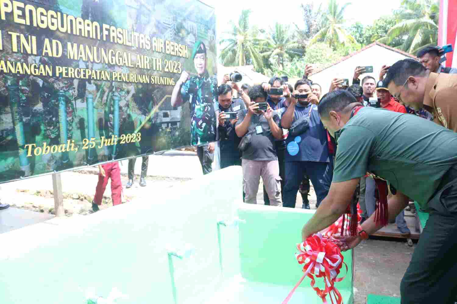Palembang, (Pendam II/Sriwijaya) Komandan Korem (Danrem) 045/Garuda Jaya, Brigjen TNI A. Dedy Prasetyo meresmikan sumur Bor dan pemberian Bantuan Sosial serta peresmian penggunaan fasilitas air bersih program TNI AD Manunggal air tahun 2023 dan pencanangan percepatan penurunan stunting, di Desa Rias, Kecamatan Toboali, Kabupaten Bangka Selatan (Basel), Selasa (25/7/2023).