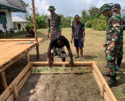 KOLABORASI PRAJURIT SATGAS RAIDER 200 BERSAMA MASYARAKAT APALAPSILI, PAPUA BANGUN PANGGUNG DIHALAMAN GEREJA