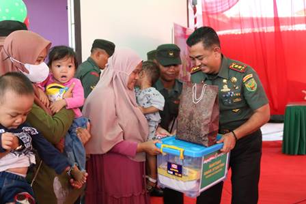 Bentuk kepedulian dan perhatian serta dukungan dari TNI AD dalam penanganan terhadap masalah stunting kali ini bersamaan dengan pencanangan percepatan penurunan stunting melaui virtual bersama KASAD Jendral TNI Dr. Dudung Abdurachman , S.E , M.M, bertempat di Panti Asuhan Alkhoiriyah Kelurahan Gajah Mada Kecamatan Rangkui, Selasa (25/7/2023). Diketahui stunting merupakan kondisi kekurangan gizi kronis pada anak yang mempengaruhi tumbuh kembang dan kecerdasan, kekurangan gizi terjadi sejak bayi dalam kandungan pada masa awal setelah bayi lahir, akan tetapi kondisi stunting baru nampak setelah bayi berusia 2 tahun. Usai kegiatan Dandim 0413/Bangka Letkol Arm Firstya Andrean Gitrias, S.H,M.M mengatakan bahwa dalam hal ini Kodim 0413/Bangka akan terus berupaya selalu ada untuk masyarakat di mana kegiatan ini merupakan kepedulian dan perhatian TNI AD dalam rangka pencanangan percepatan penurunan stunting. "Semoga bantuan yang di berikan ini dapat bermanfaat dan dapat menambah gizi bagi anak-anak terindikasi pendertia stunting," ucapnya. Lebih lanjut, Dandim menegaskan bahwa kegiatan tersebut merupakan tindak lanjut atas instruksi Presiden Republik Indonesia yang menargetkan angka pencegahan stunting dalam skala nasional, selain itu pencegahan stunting juga merupakan perintah KASAD selaku Duta Bapak Asuh Anak Stunting, " tegas Letkol Arm Firstya Andrean Gitrias, S.H,M.M .