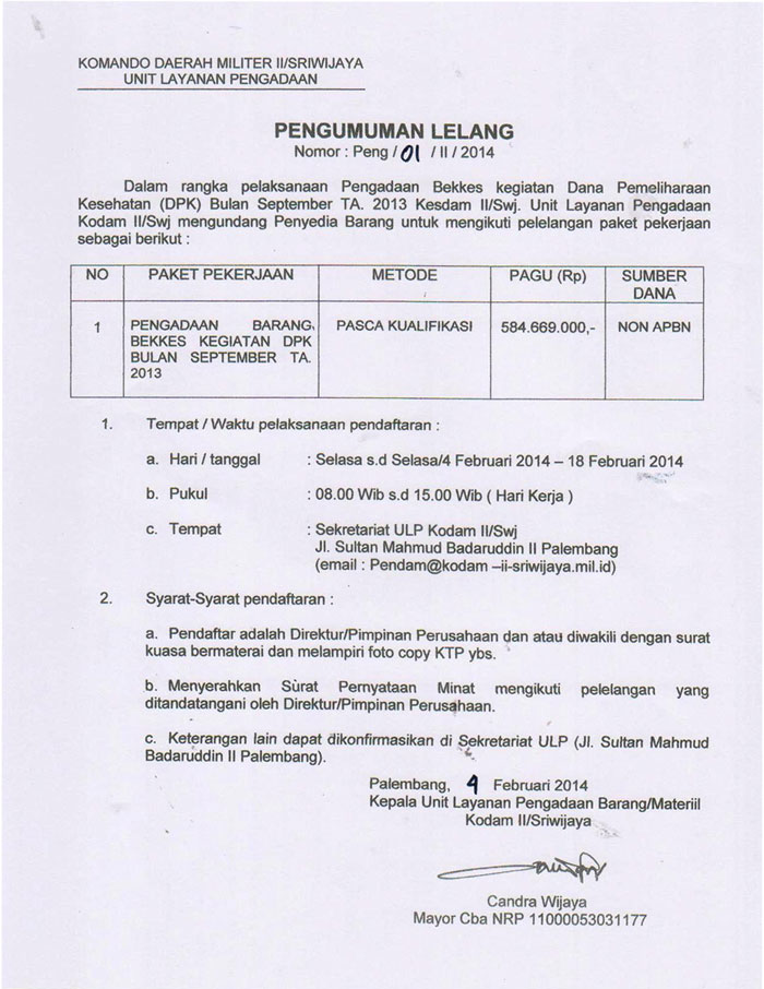 KOMANDO DAERAH MILITER II/SRIWIJAYA UNIT LAYANAN PENGADAAN PENGUMUMAN LELANG Nomor : Peng / 01/ II / 2014 Dalam rangka pelaksanaan Pengadaan Bekkes kegiatan Dana Pemeliharaan Kesehatan (DPK) Bulan September TA. 2013 Kesdam II/Swj. Unit Layanan Pengadaan Kodam II/Swj mengundang Penyedia Barang untuk mengikuti pelelangan paket pekerjaan sebagai berikut :