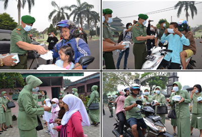 "Kita lihat kabut asap semakin tebal dalam beberapa hari terakhir ini. Sebagai antisipasi meningkatnya penderita Inpeksi Saluran Pernapasan Akut (ISPA), kita upayakan pencegahan agar kasus ISPA yang bisa disebabkan udara tidak sehat meningkat dengan membagikan masker," ungkap Komandan Korem 042/Gapu Kolonel Kav Marsudi Utomo,S.Sos, pada saat membagikan masker di Jalan Urip Sumoharjo Telanai Pura Jambi, pagi tadi. Ada 4 titik pembagian masker oleh satua jajaran Korem 042/Gapu, di depan Makorem 042/Gapu, Depan Batalyon 142/Ksatria Jaya, depan Denkesyahrem 042/Gapu, depan Denpom Jambi dan SD/TK Kartika.Adapun masker yang dibagikan secara gratis sebanyak 10 ribu masker.
